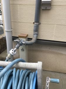 屋外の水栓を使用すると緩衝材が巻かれている給水菅から水が流れてくるので