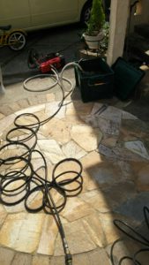 洗濯機を移動させて圧力ポンプと薬剤で作業を行っていましたが